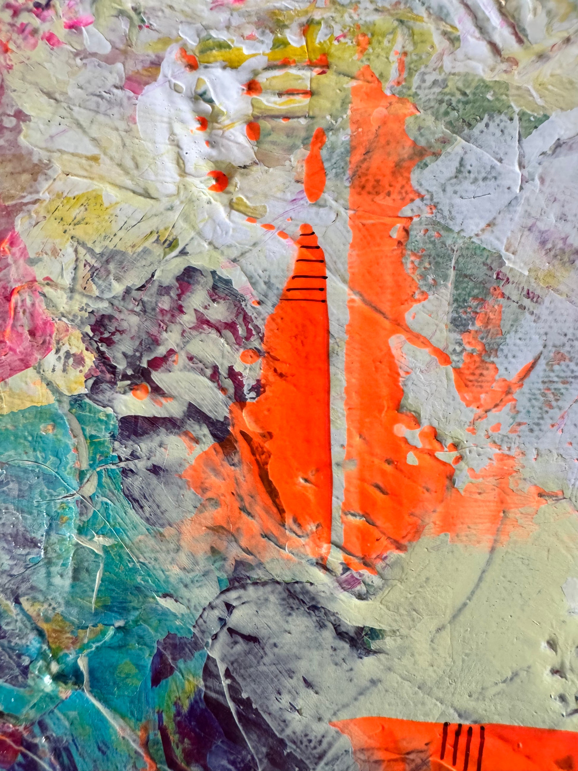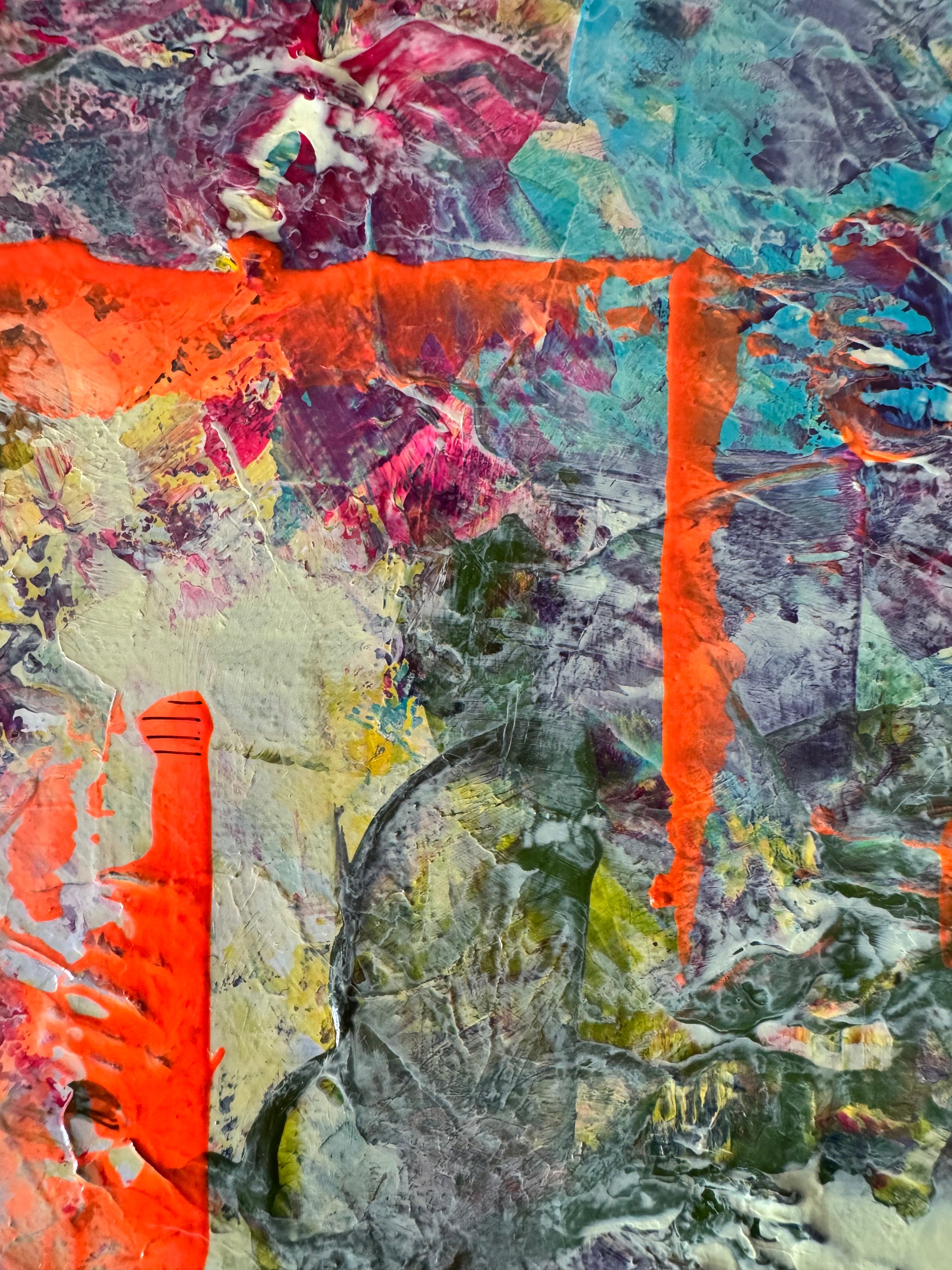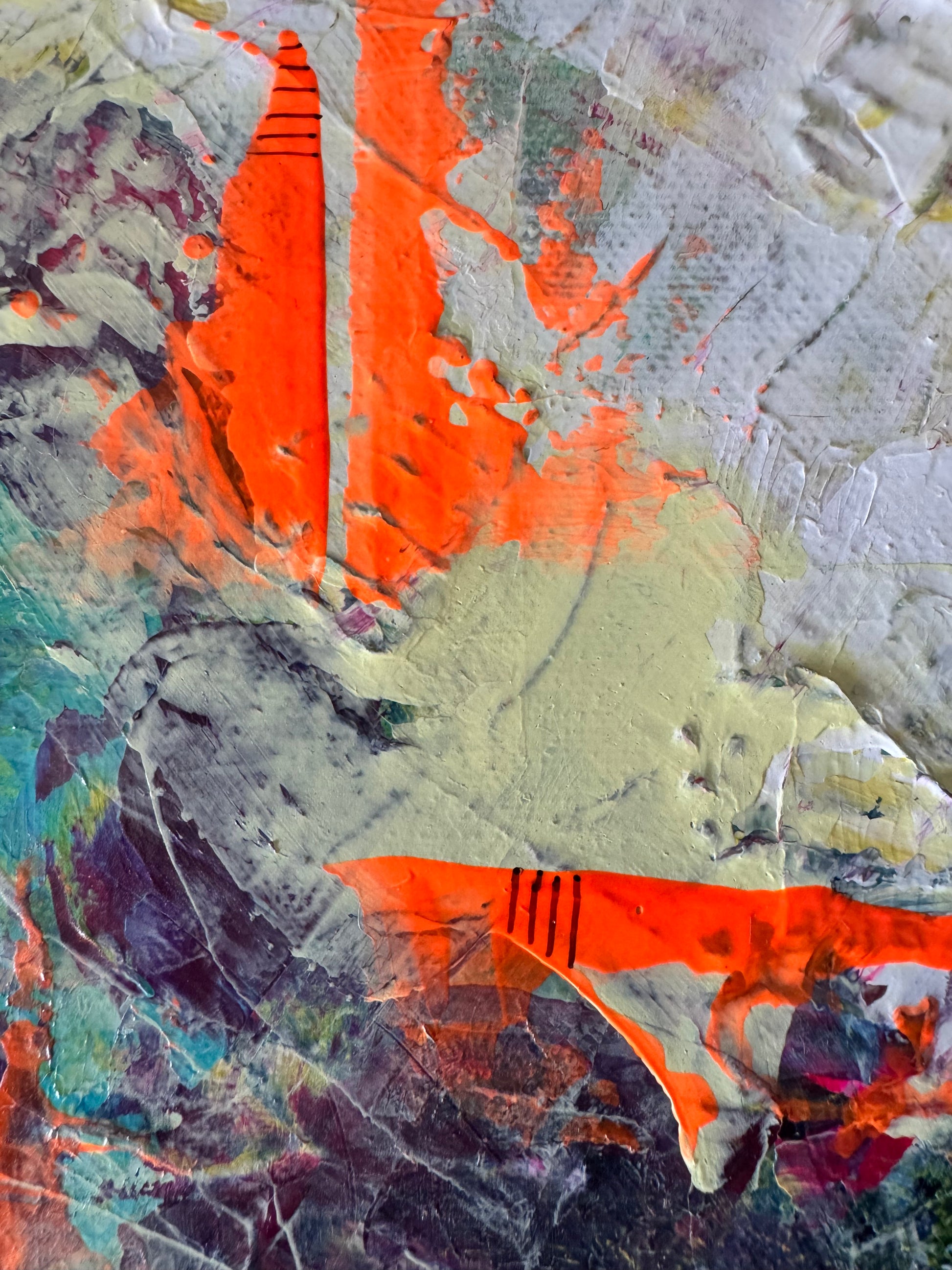 Sharp orange lines break through, framing the chaos without silencing it. They don’t restrict they anchor.