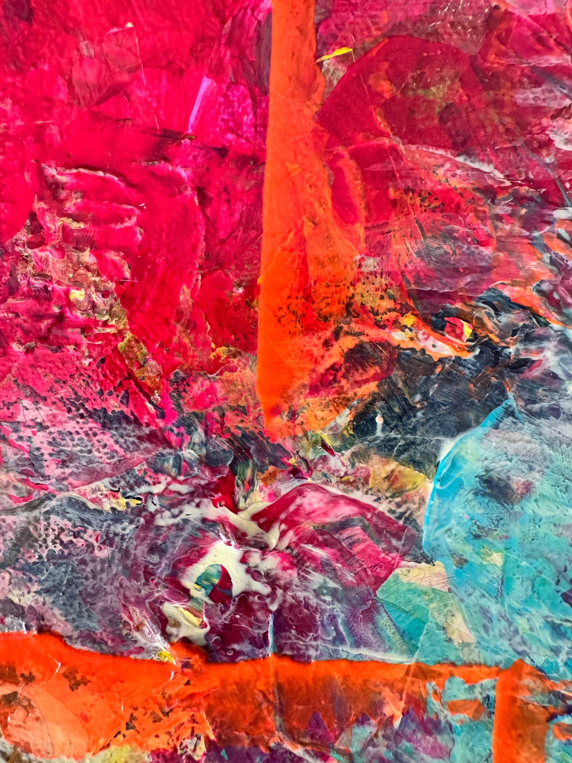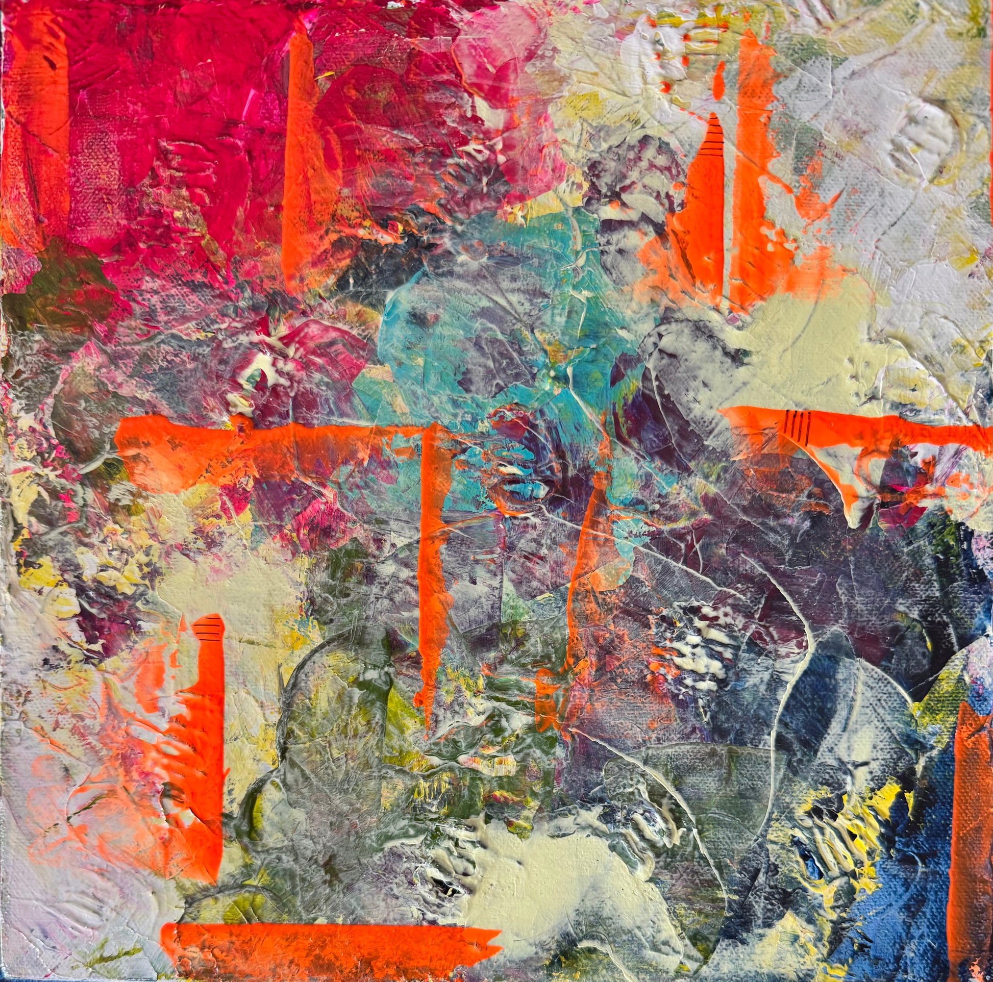 Contain The Wild explores the tension between freedom and form. Layers of vivid colour from creamy whites to deep blues and vibrant magentas build into a restless surface, alive with movement.