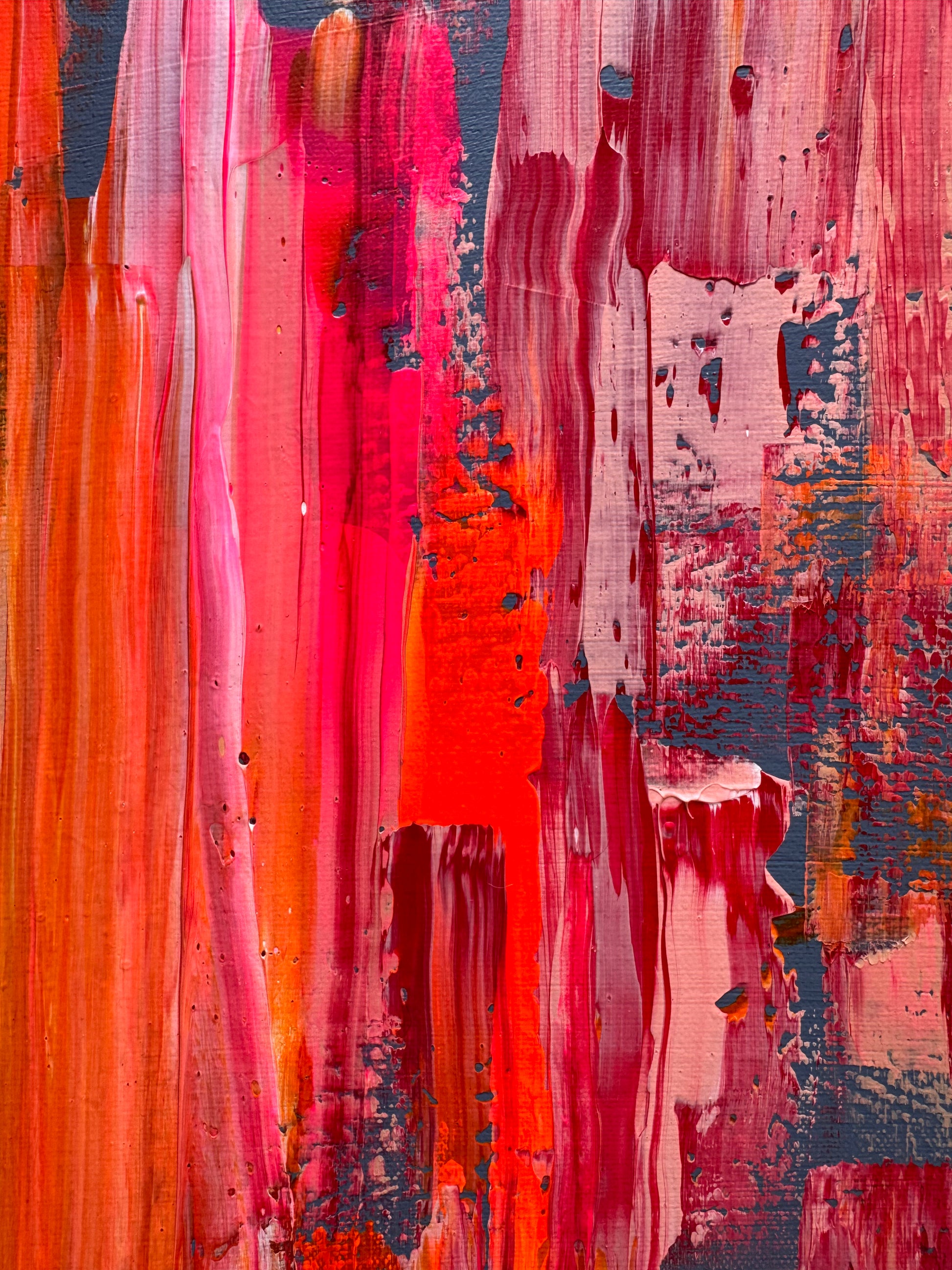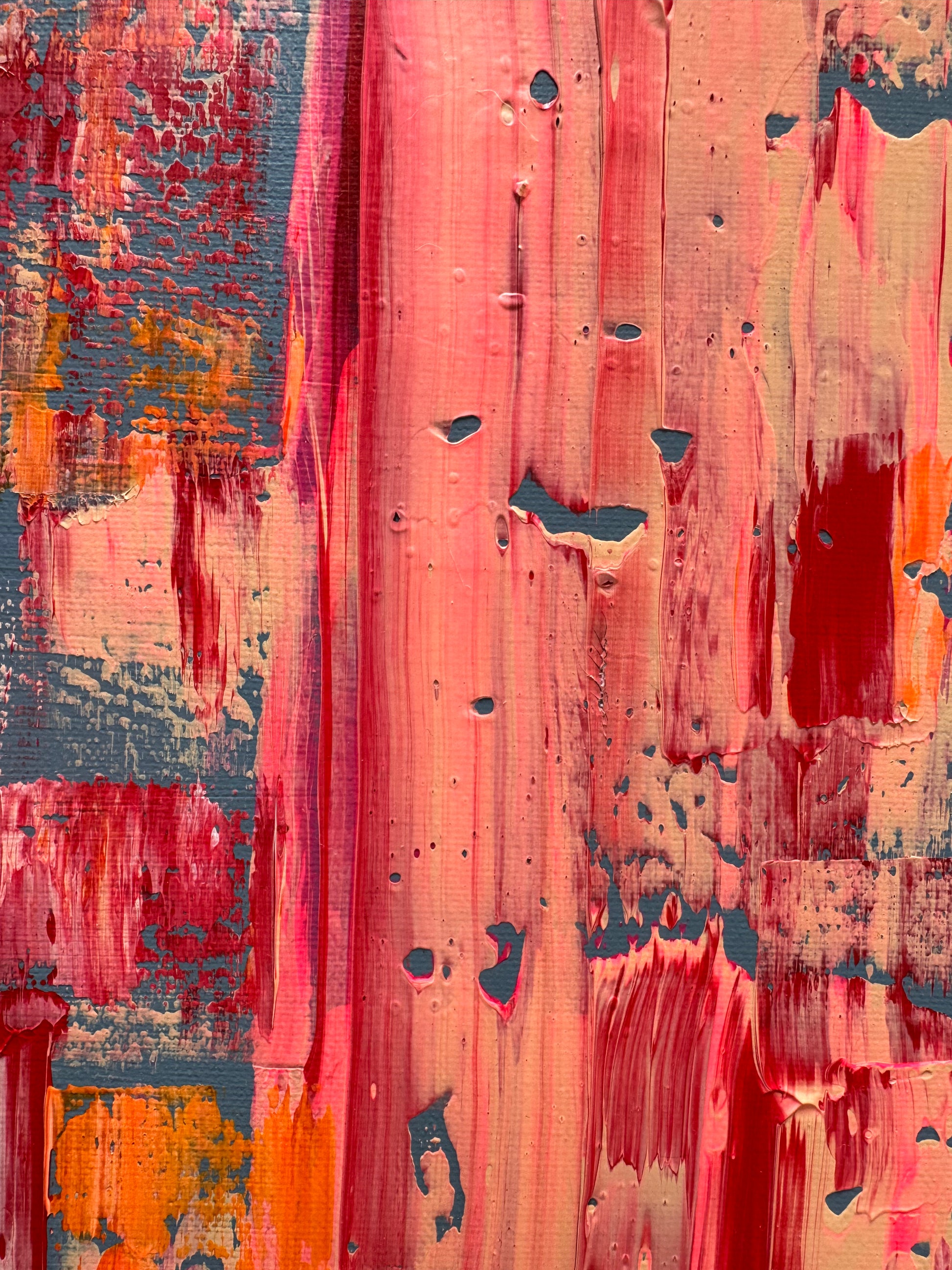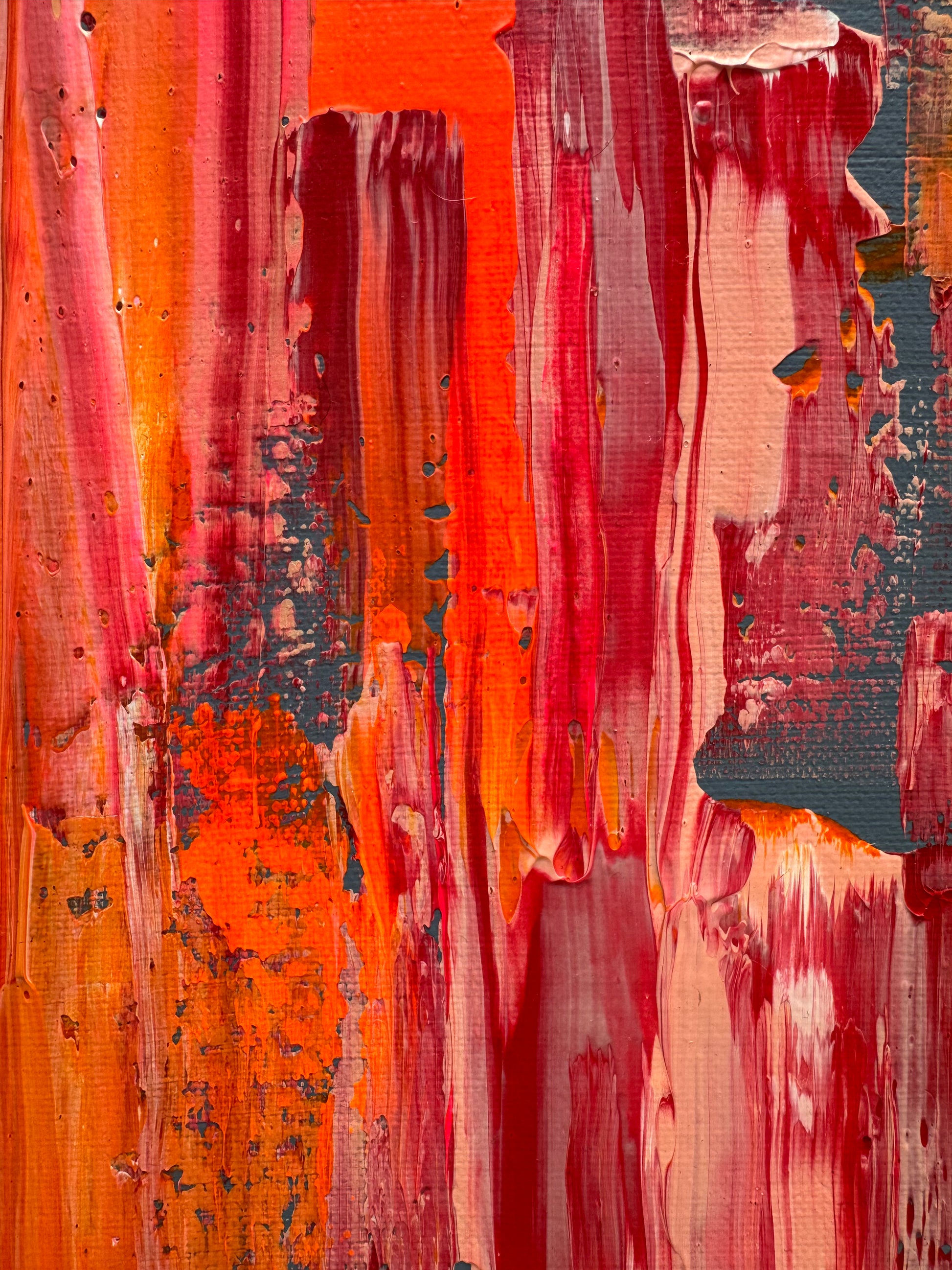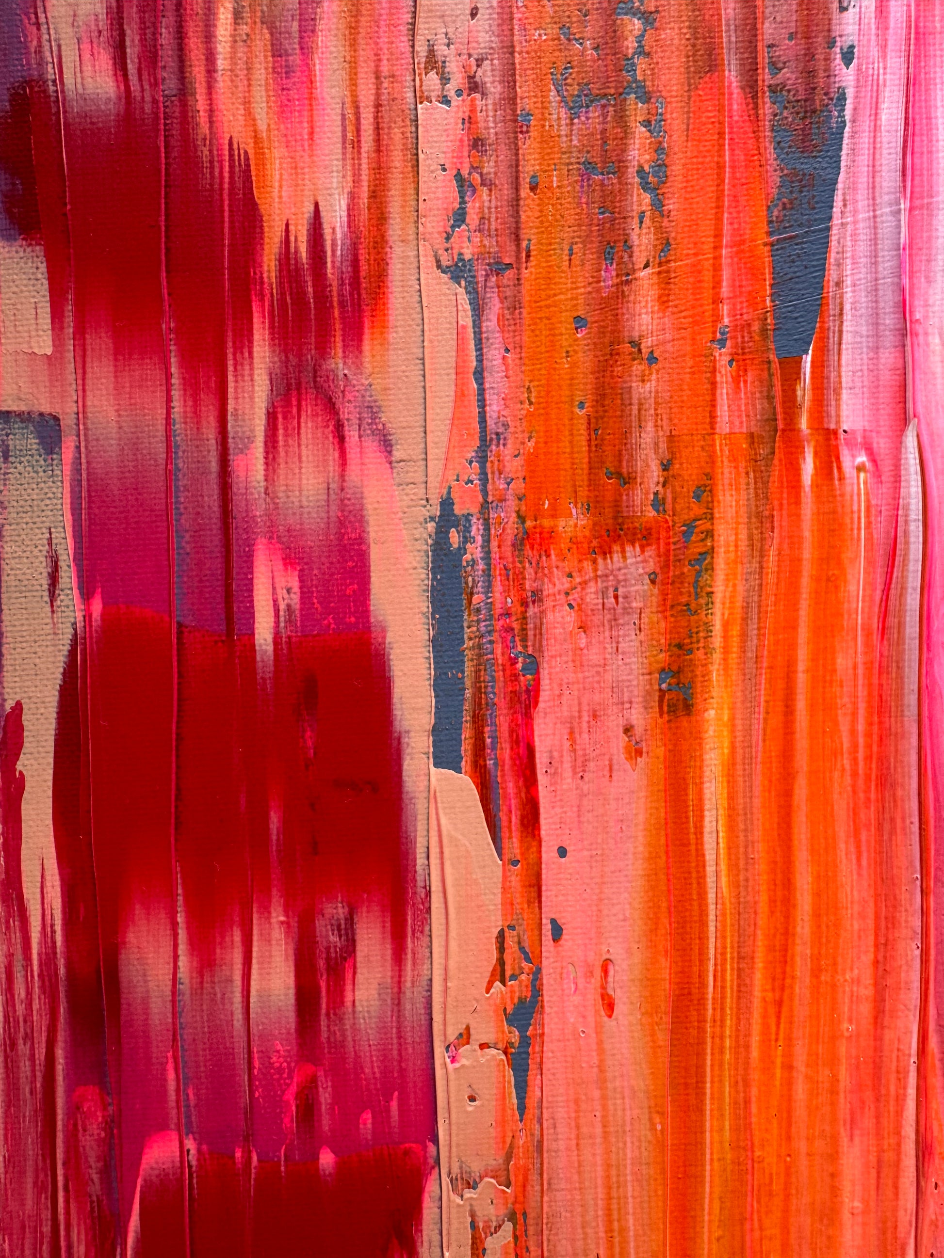 Layers of saturated coral, molten orange, deep crimson and flashes of cool slate collide across the canvas in vertical sweeps and fractured textures. The movement feels both constructed and undone — as if something is being revealed through disruption.