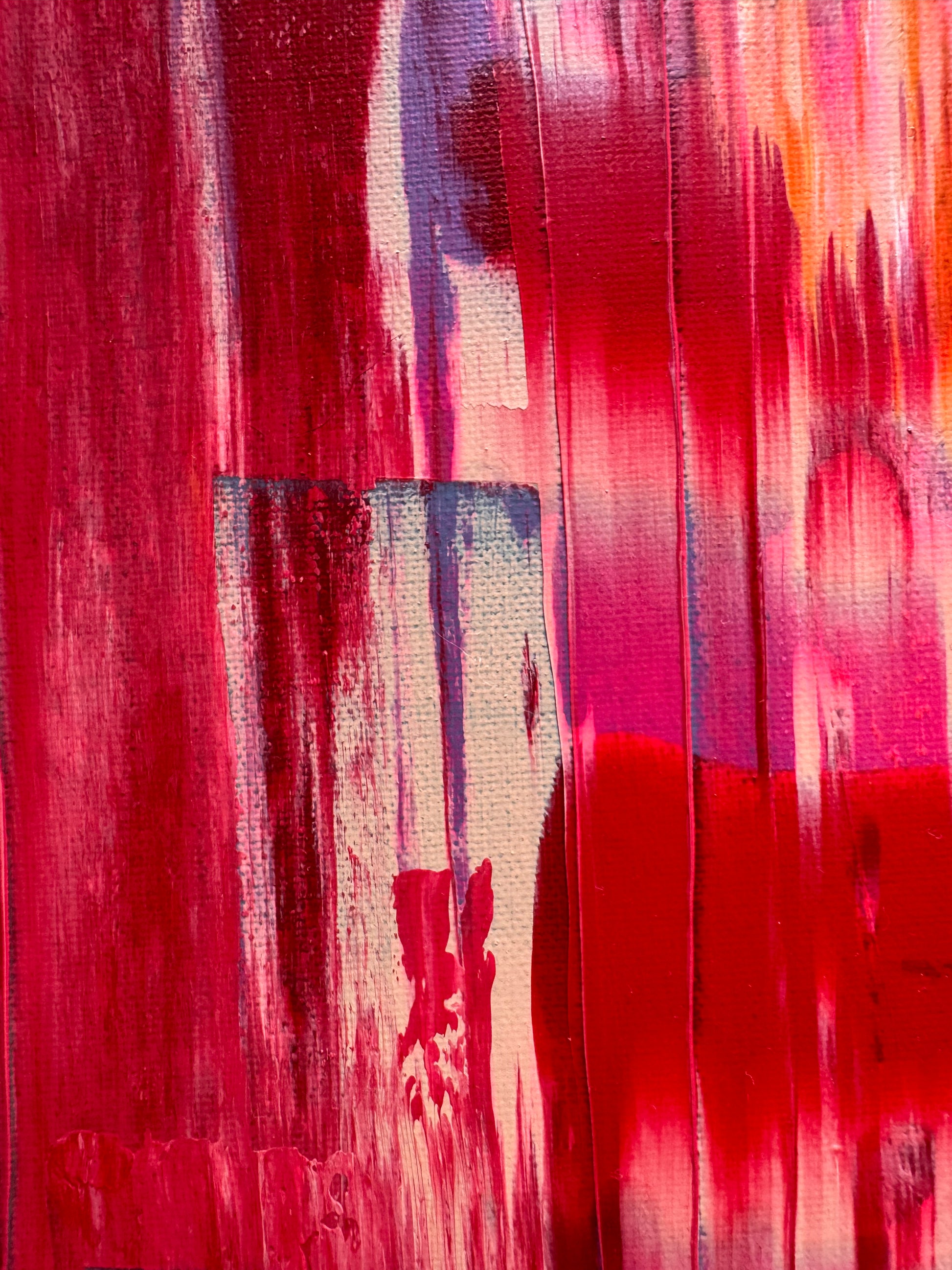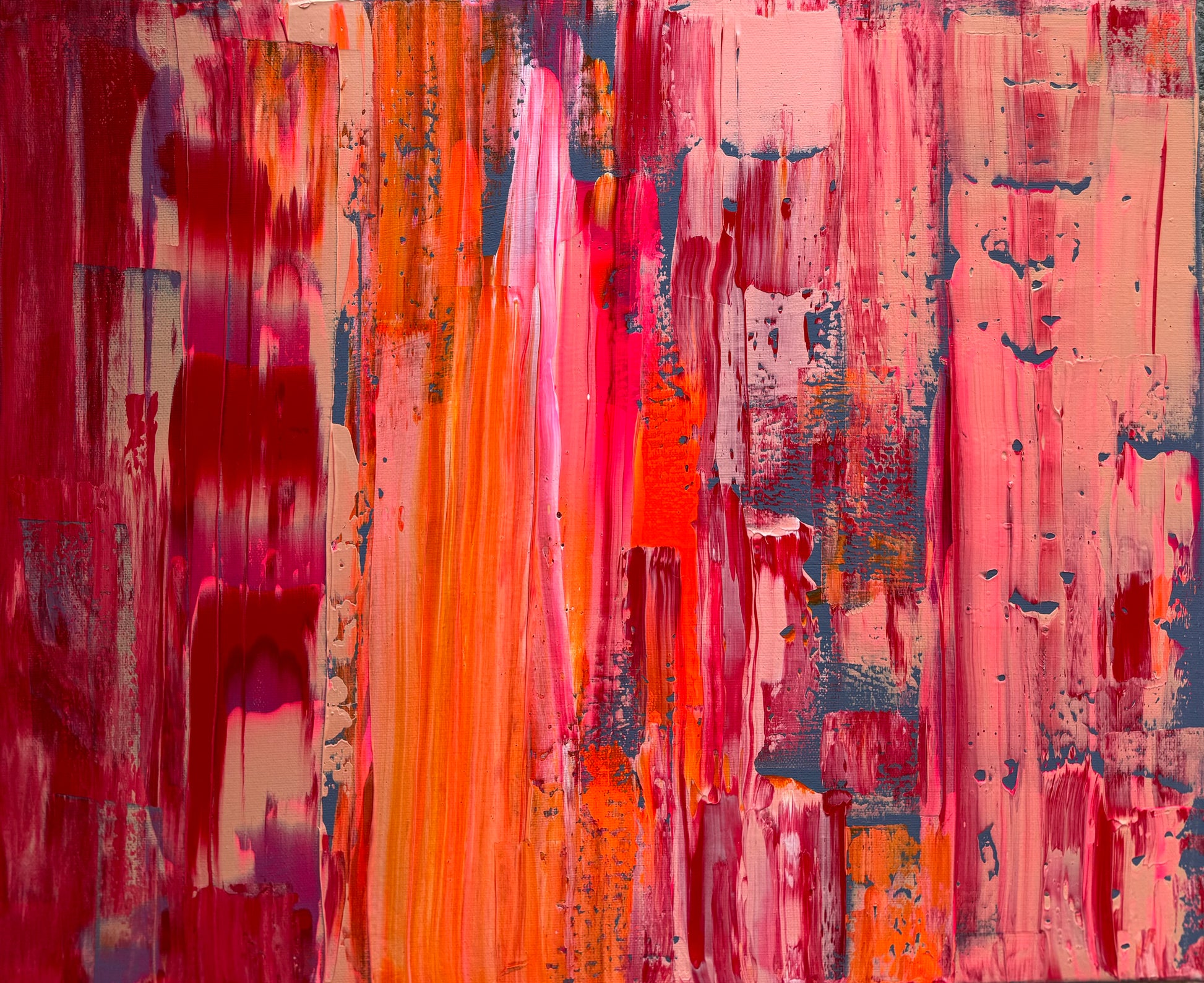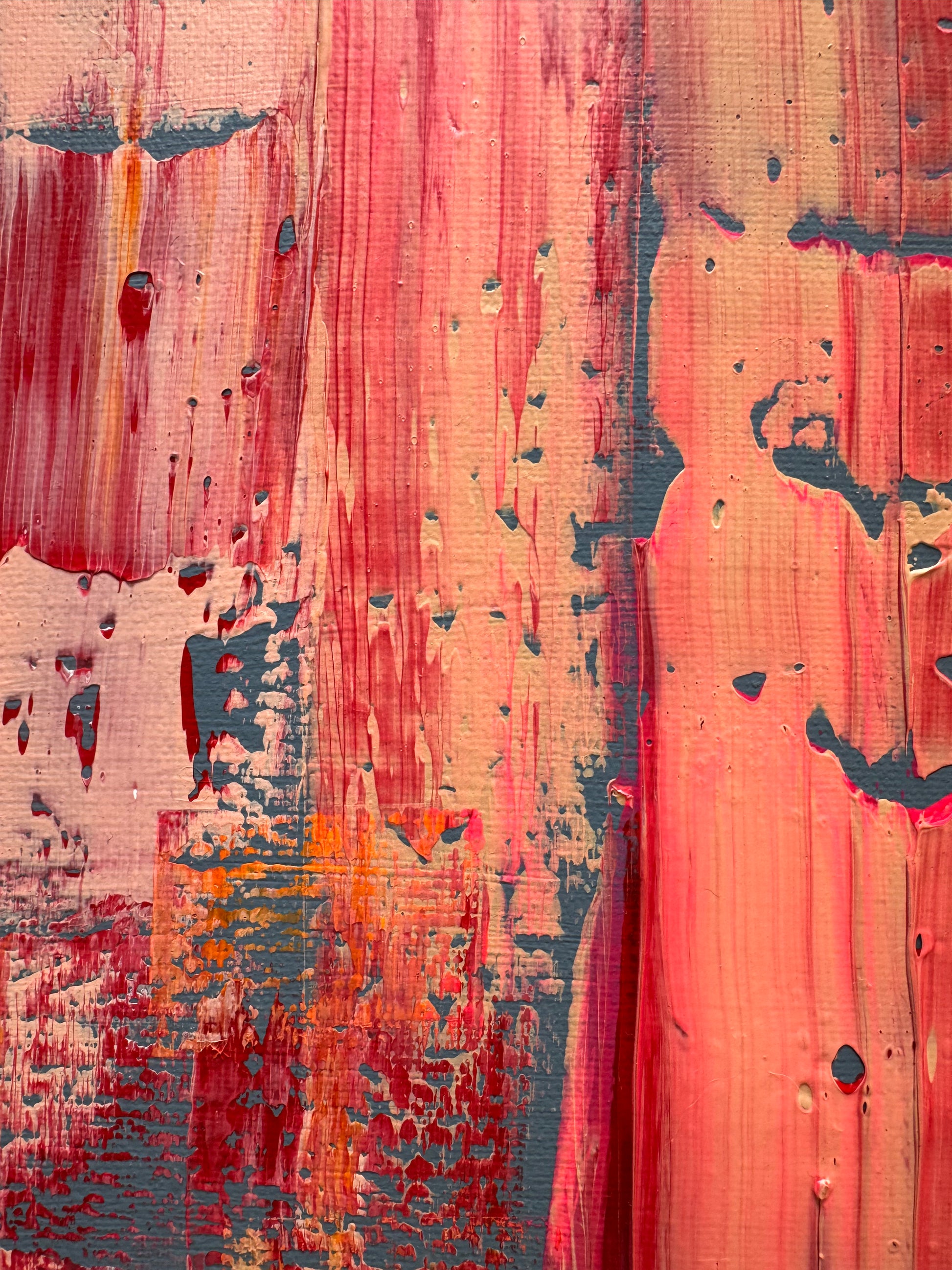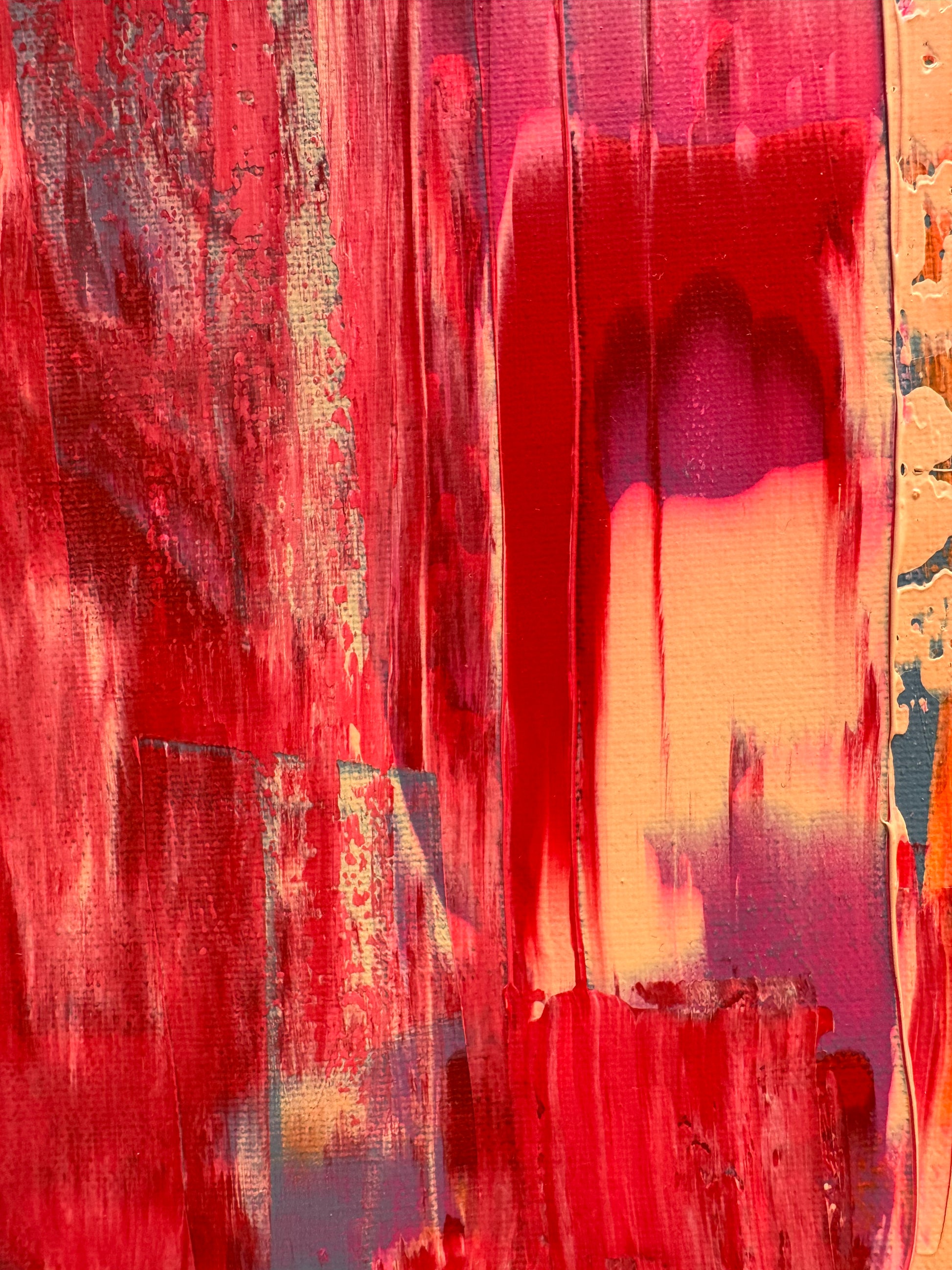 Layers of saturated coral, molten orange, deep crimson and flashes of cool slate collide across the canvas in vertical sweeps and fractured textures. The movement feels both constructed and undone — as if something is being revealed through disruption.