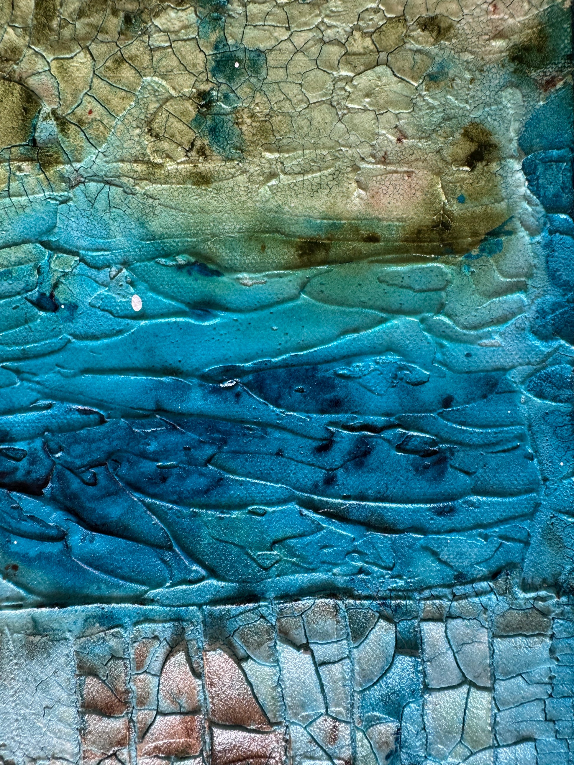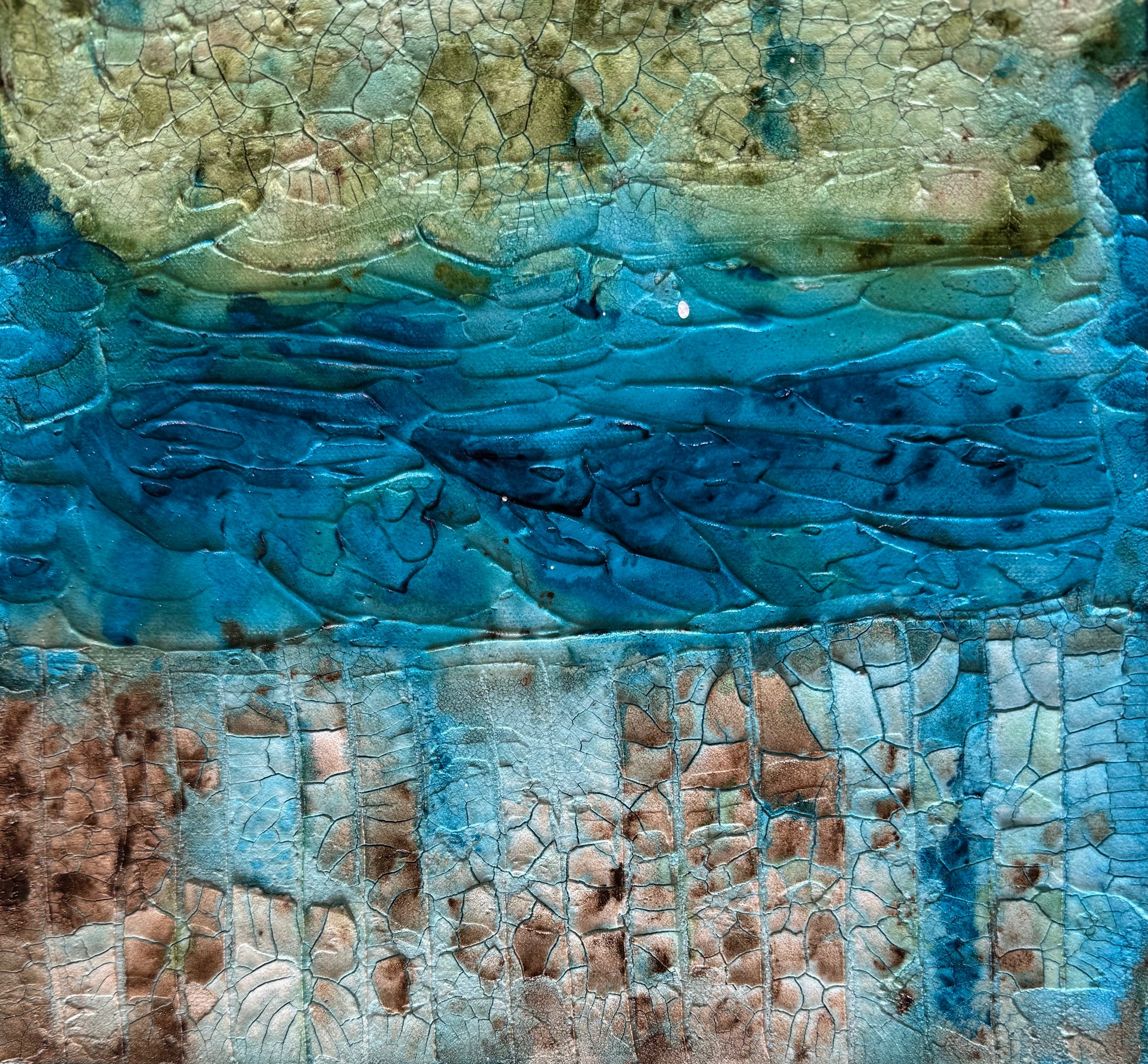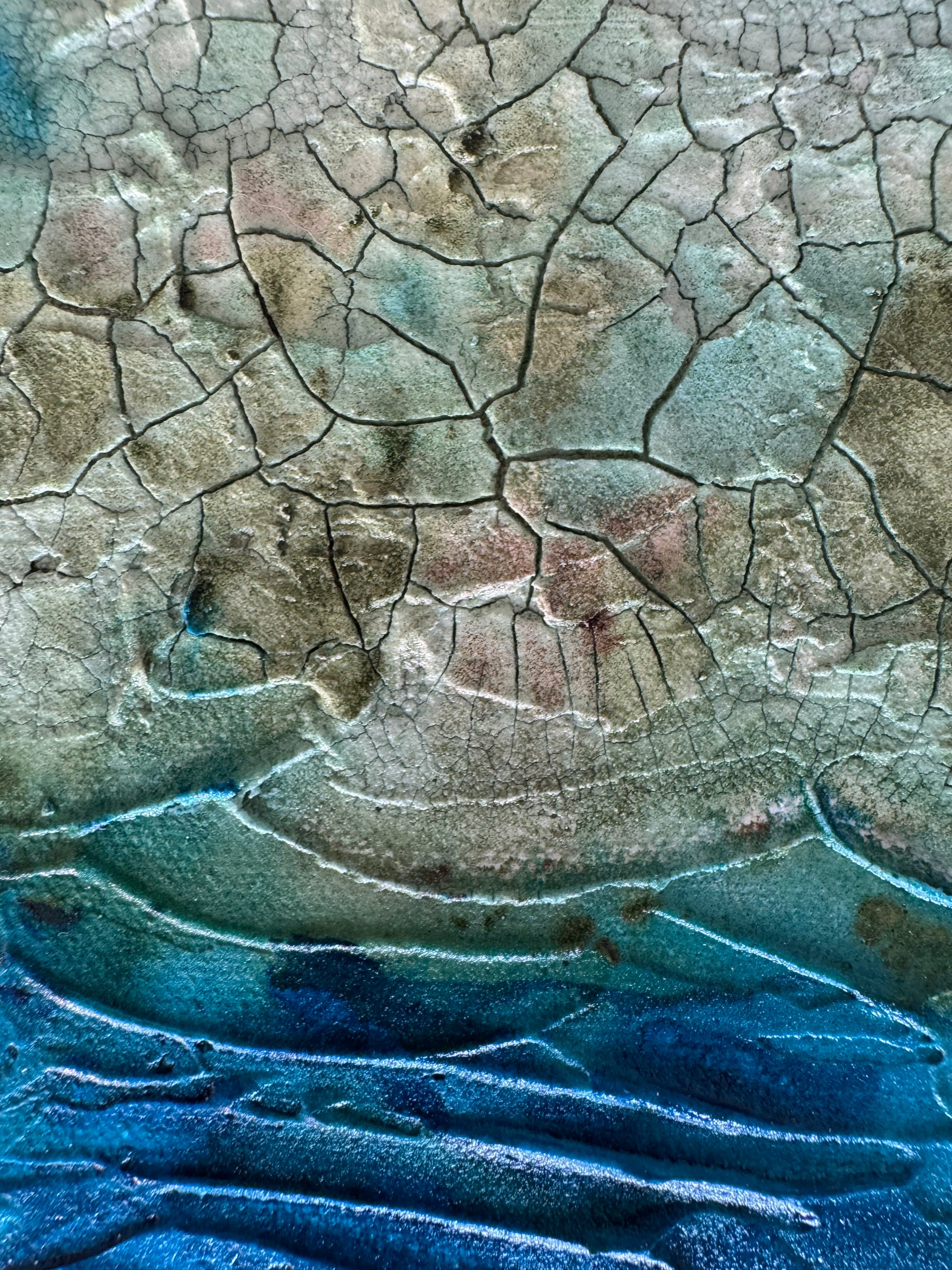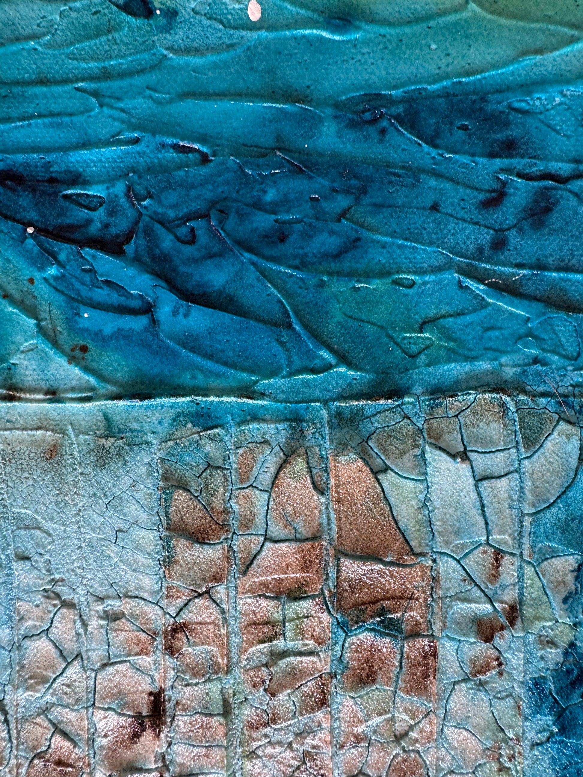 Layers of deep teal and ocean blue flow through the centre of the canvas, held above and below by textured, earth-toned bands. The cracked glaze mirrors the fractured surface of the cliffs themselves, echoing erosion, exposure and the slow imprint of time.
