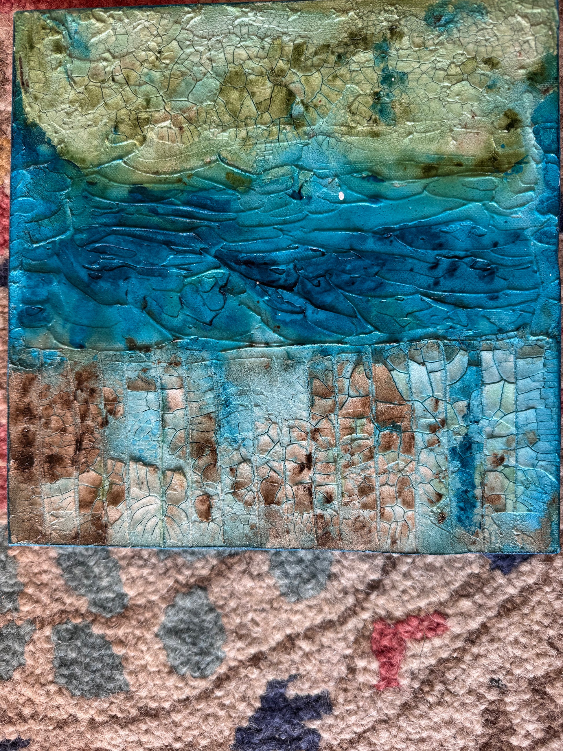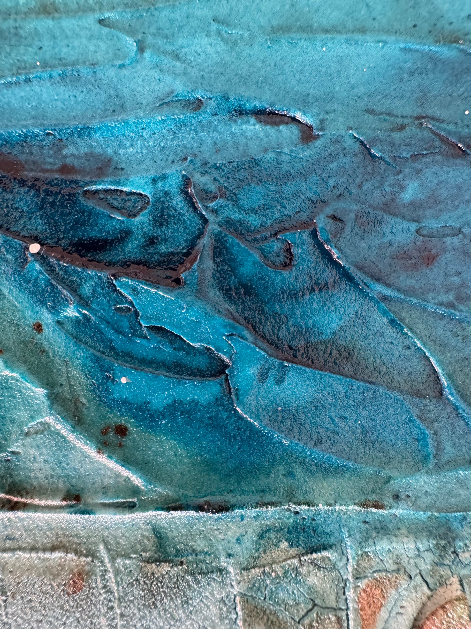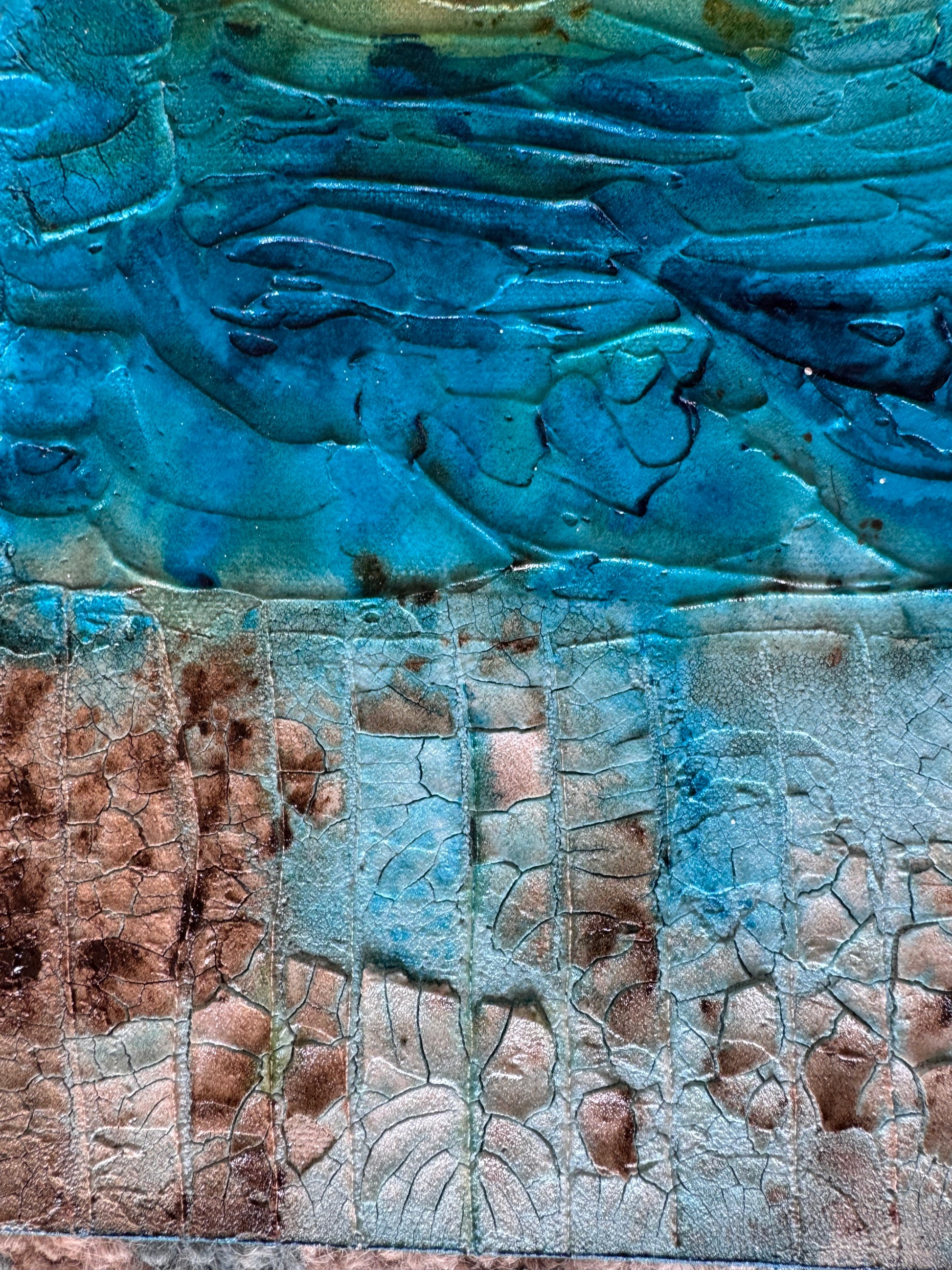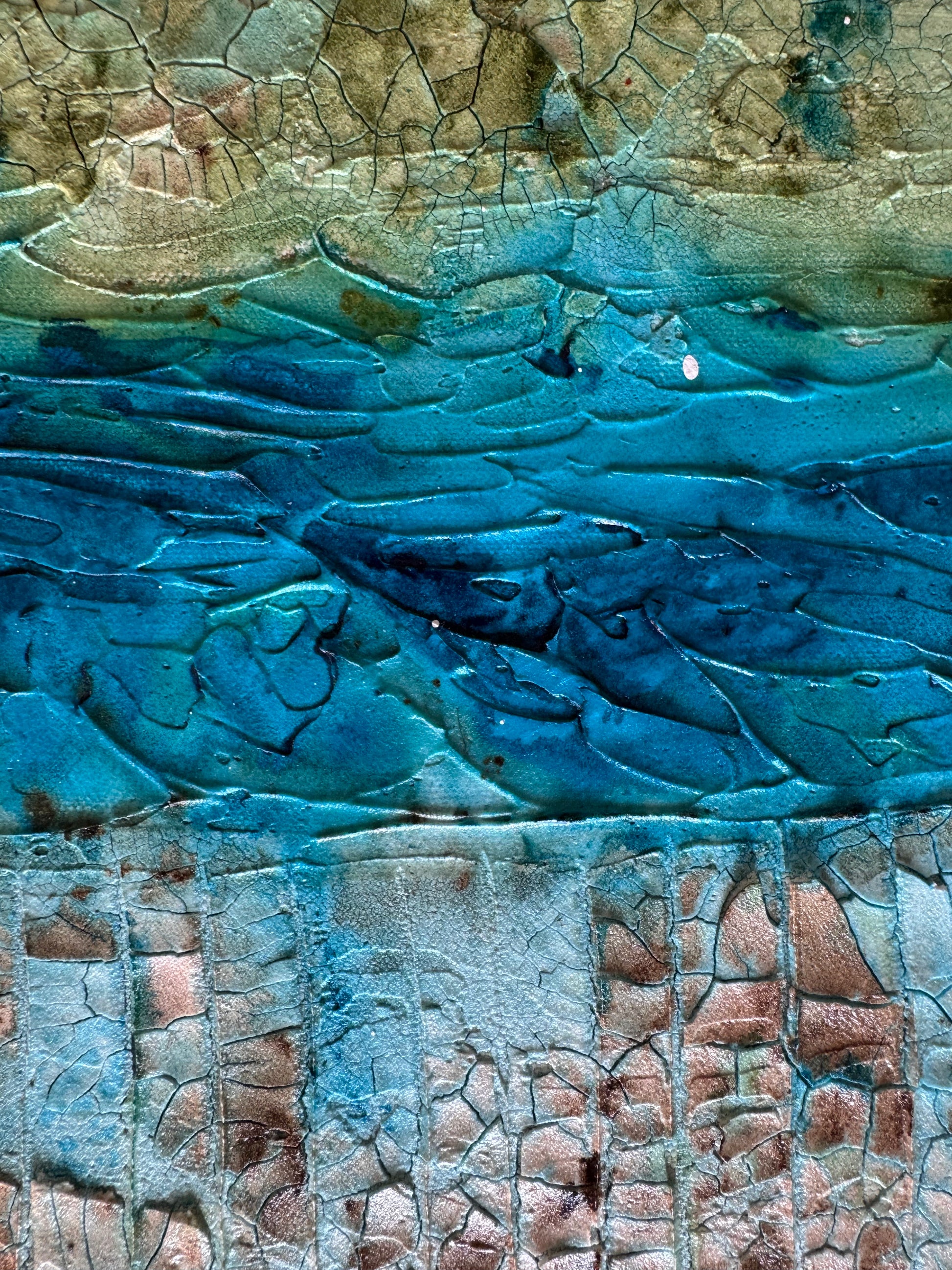 Layers of deep teal and ocean blue flow through the centre of the canvas, held above and below by textured, earth-toned bands. The cracked glaze mirrors the fractured surface of the cliffs themselves, echoing erosion, exposure and the slow imprint of time.