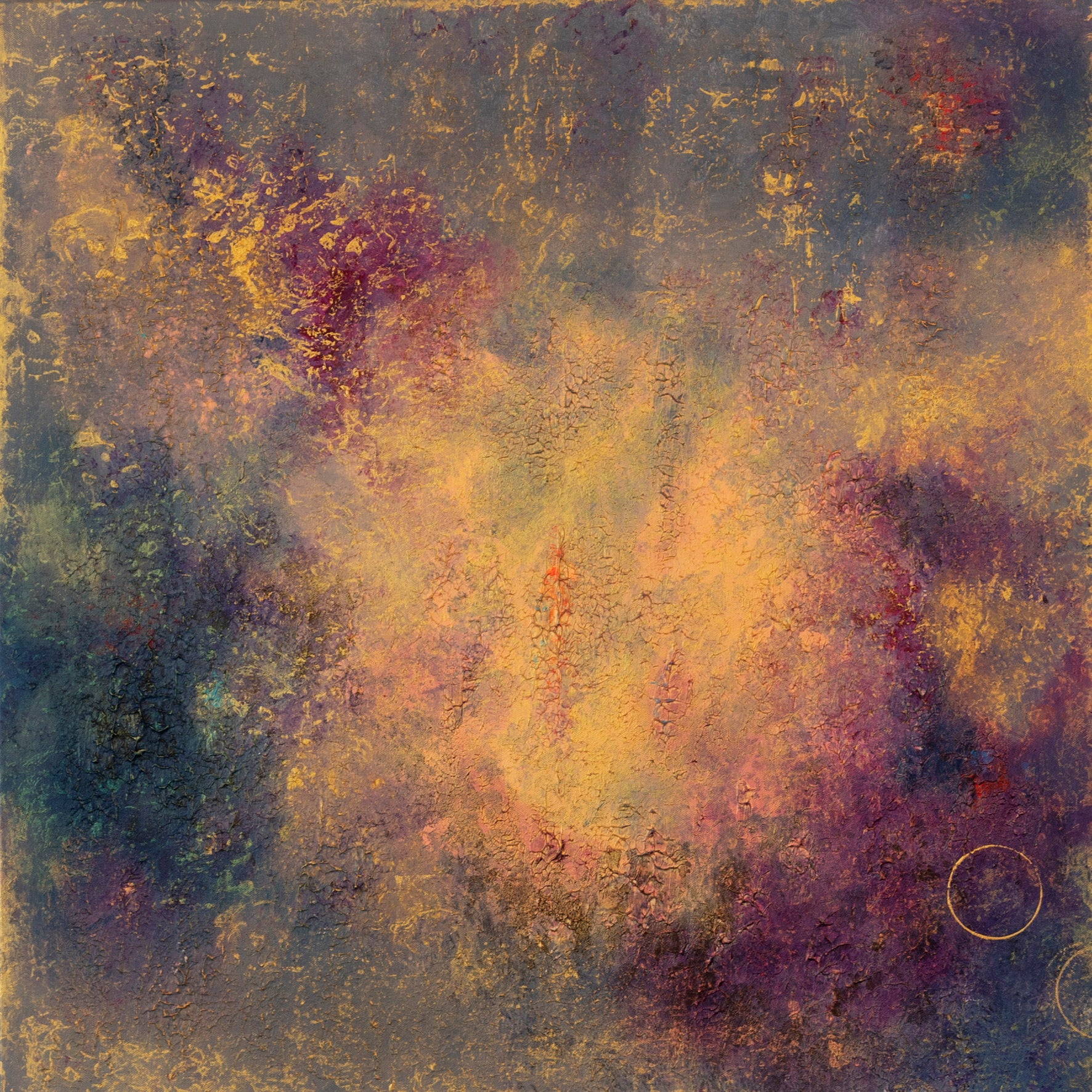 This one is clarity emerging through depth. I softened the palette deliberately. The purples and muted blues create a contemplative field, while the gold lifts through it like insight rising from reflection. There’s a central glow here, more defined than the earlier levels. Reason gathers energy rather than scattering it. The texture is quieter and more controlled. The circular form echoes awareness, but doesn’t dominate. This level feels steady and discerning. Not cold. Just clear.