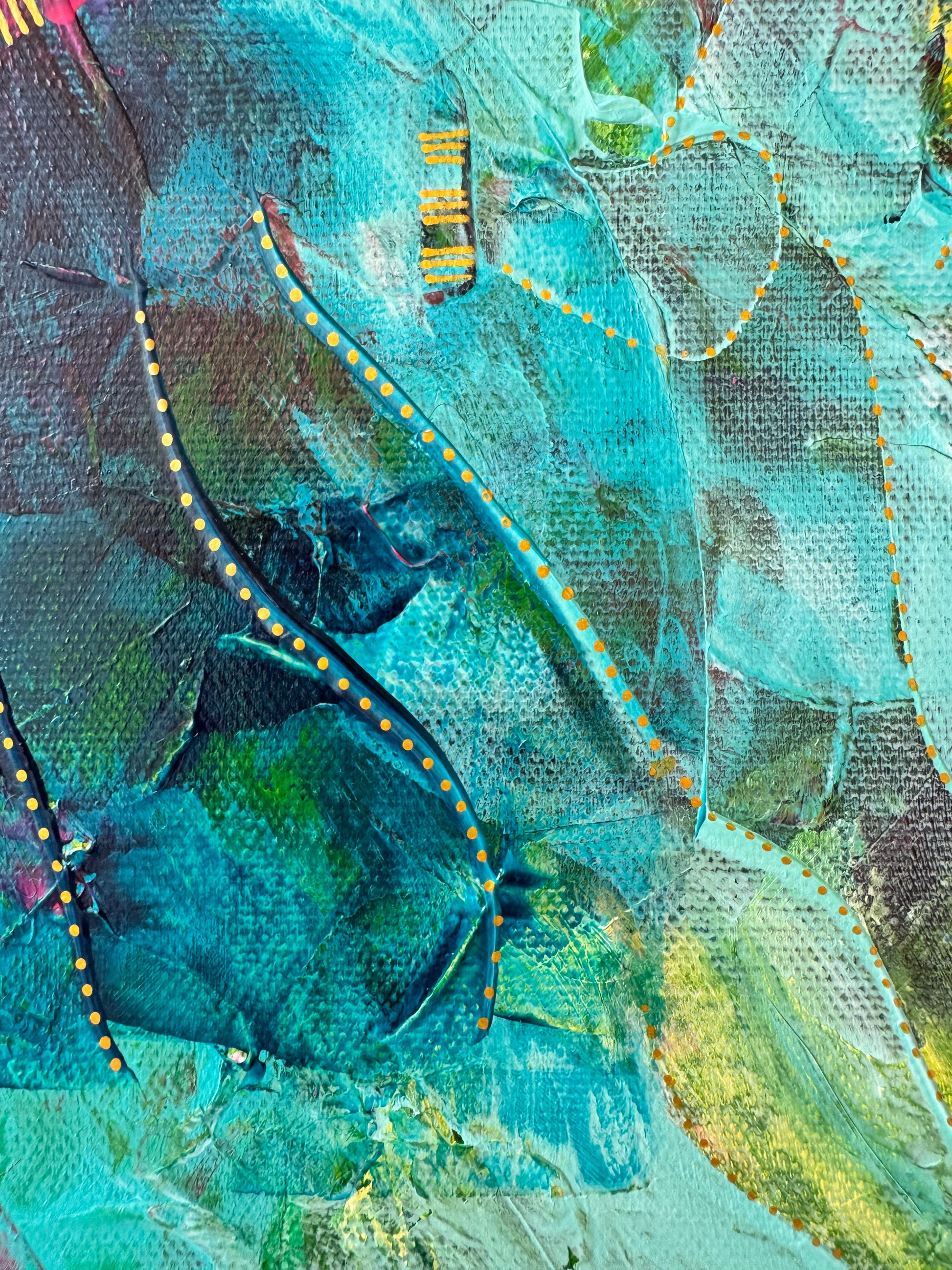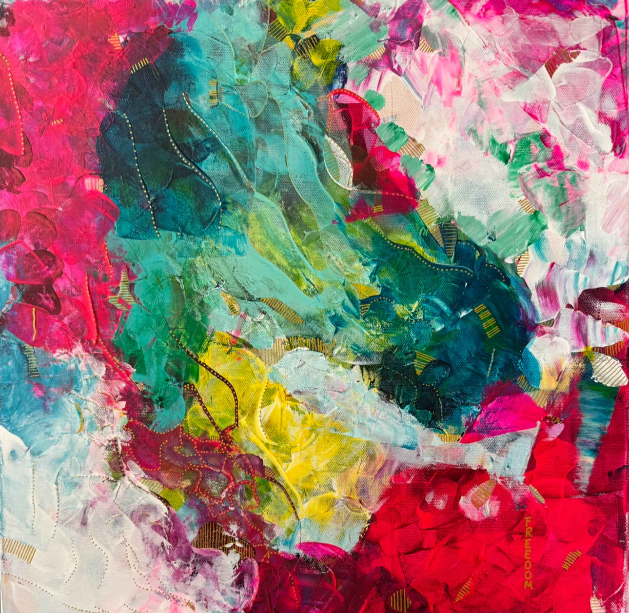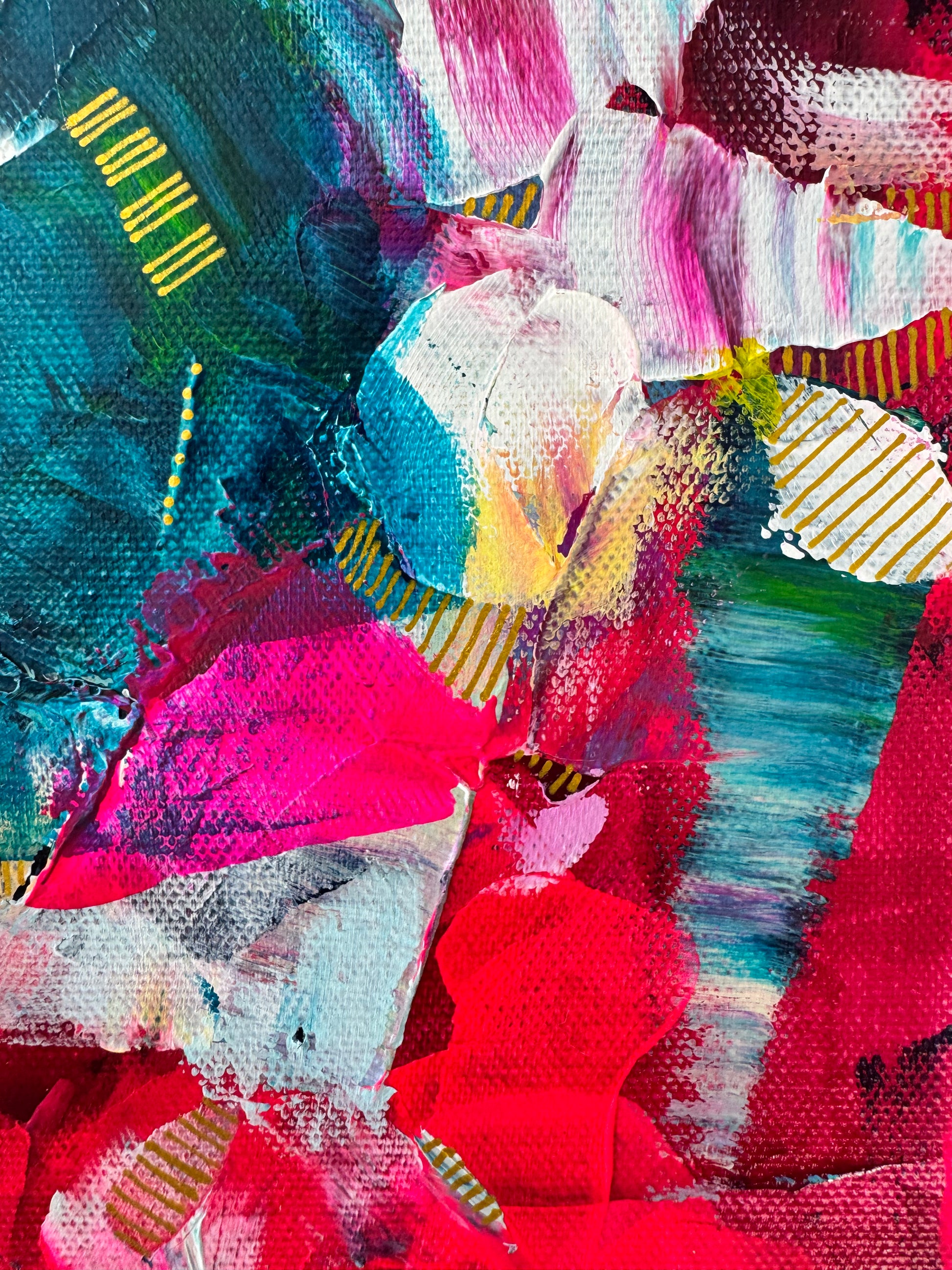 This piece radiates a vibrant, untamed energy. A dance of teal, crimson, magenta, lemon yellow, and bursts of white. The textured forms and rhythmic patterns suggest a sense of expansion and freedom, as if the painting itself is exhaling into space.