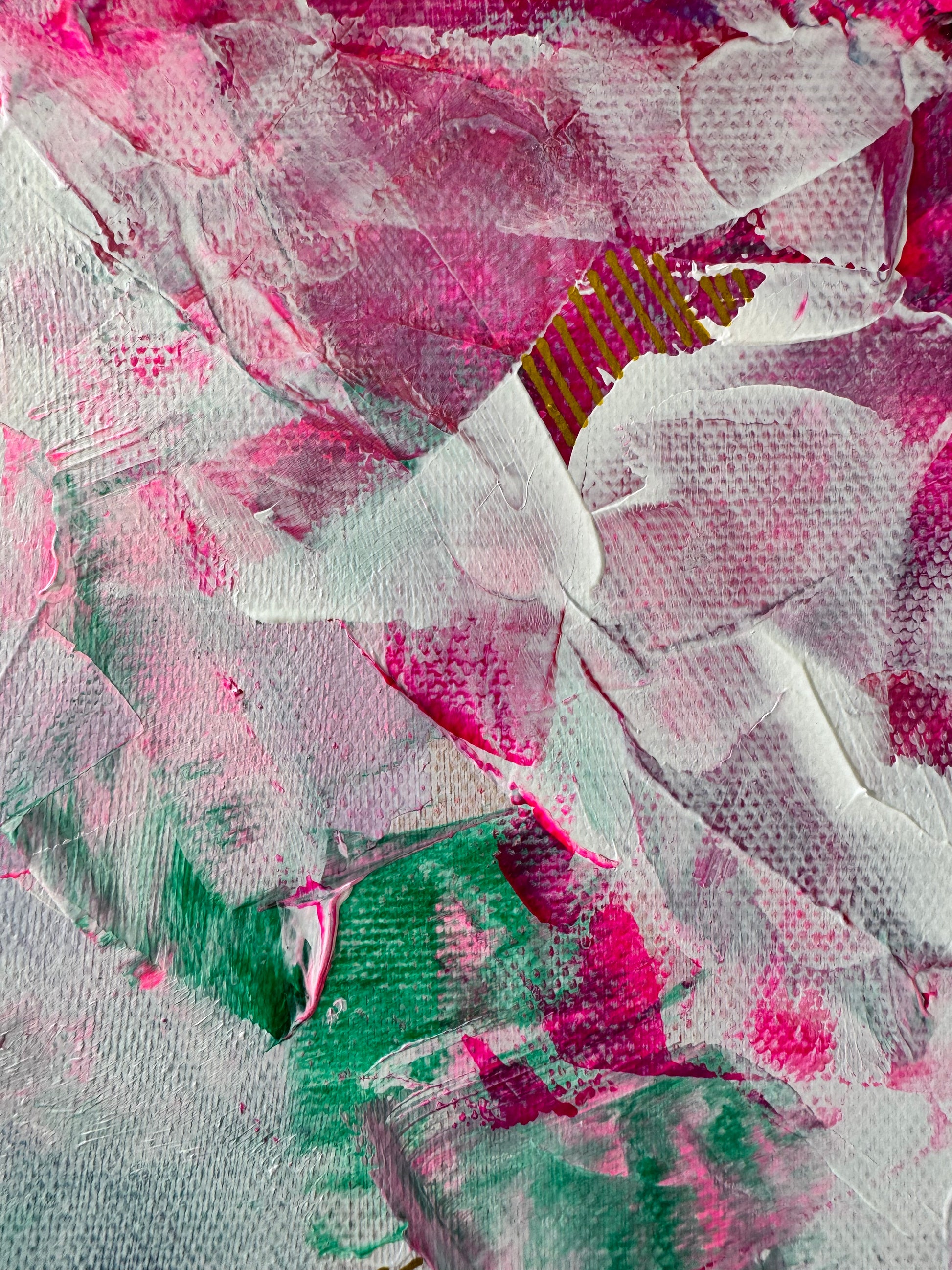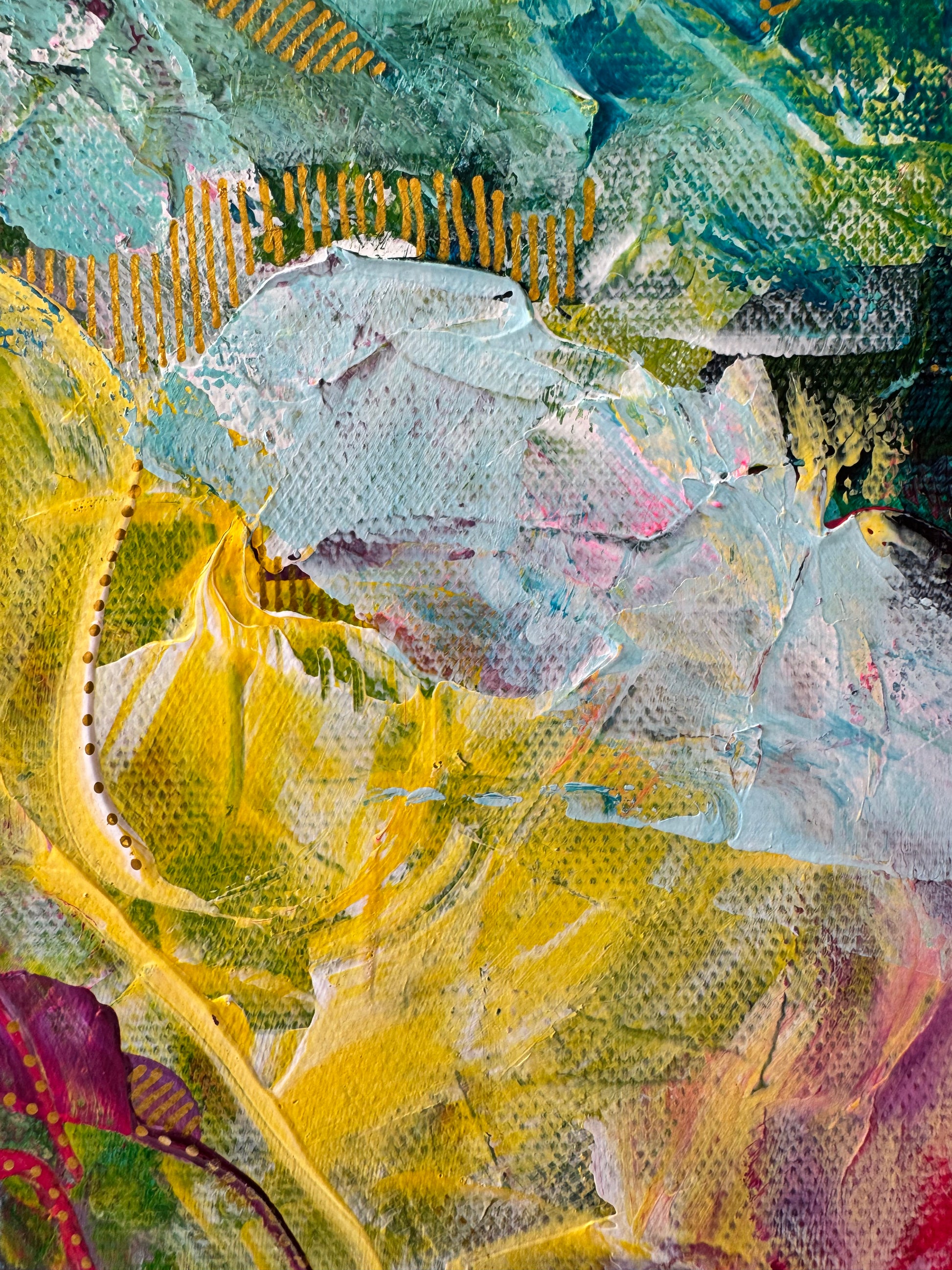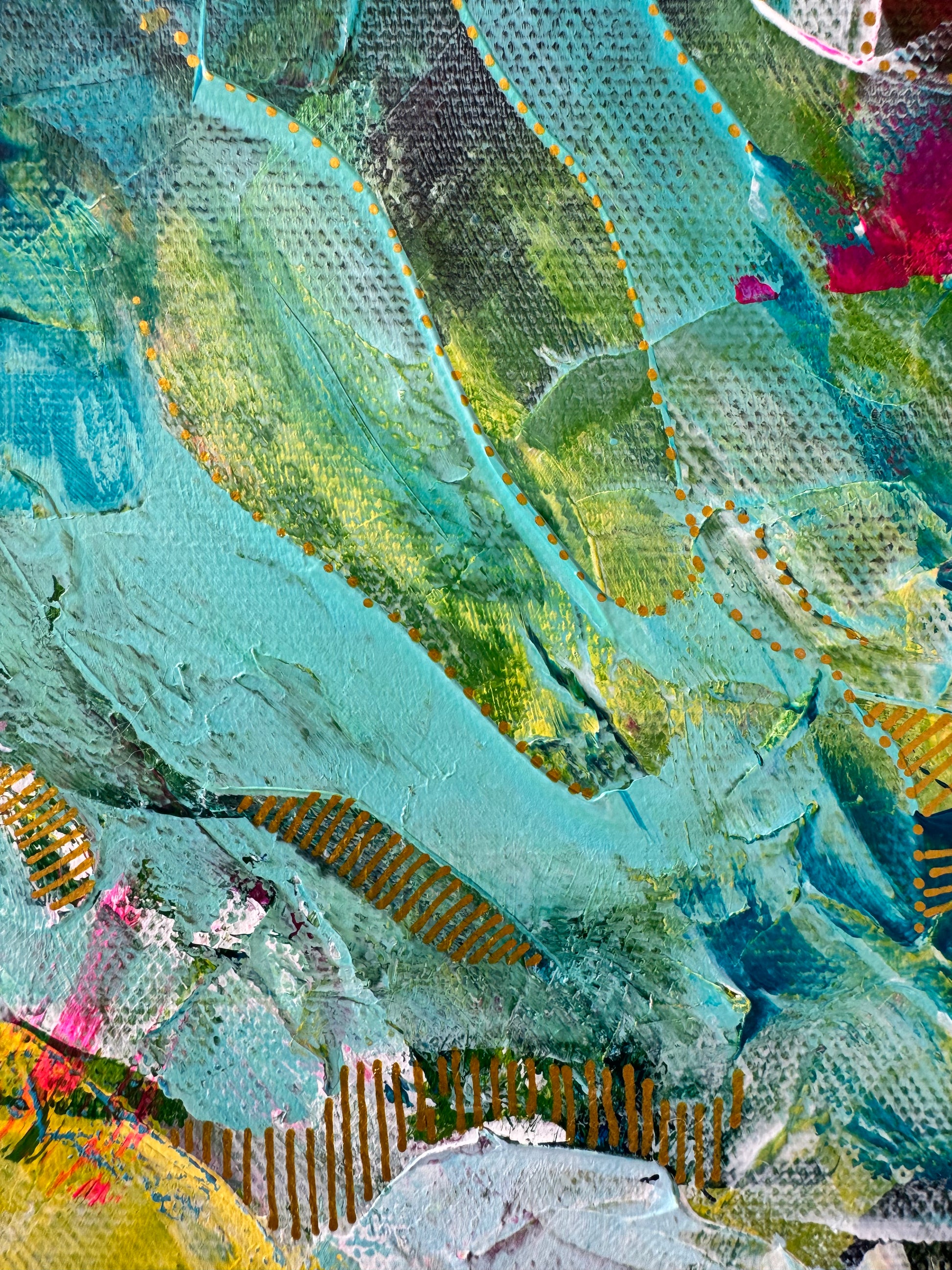 This piece radiates a vibrant, untamed energy. A dance of teal, crimson, magenta, lemon yellow, and bursts of white. The textured forms and rhythmic patterns suggest a sense of expansion and freedom, as if the painting itself is exhaling into space.