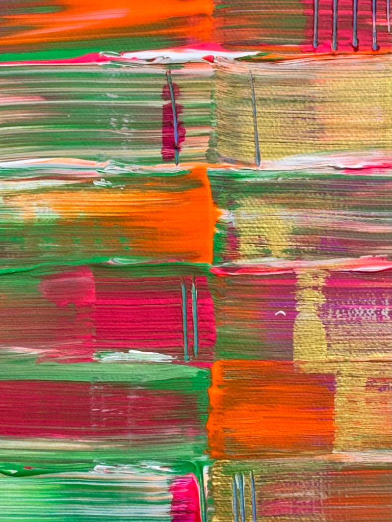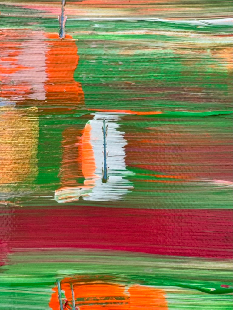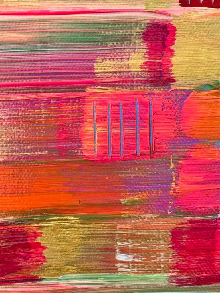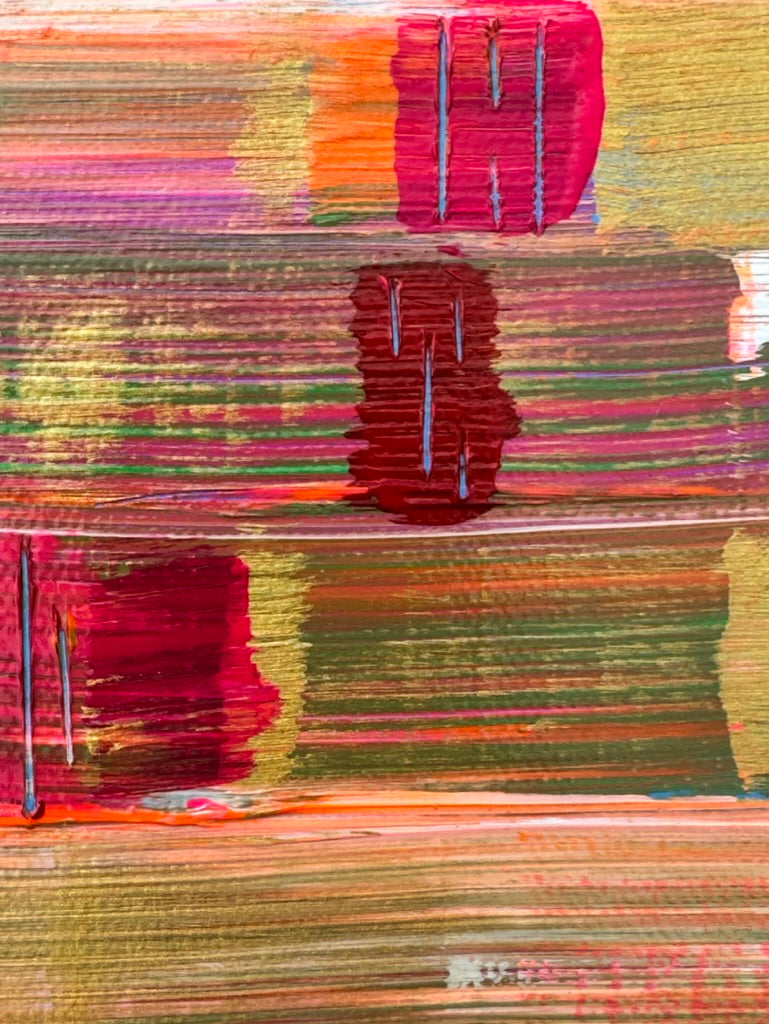 The way the colours layer and push against each other evokes the feeling of slipping between timelines. The brush strokes and vertical marks feel like codes holding the memory of transition and change.