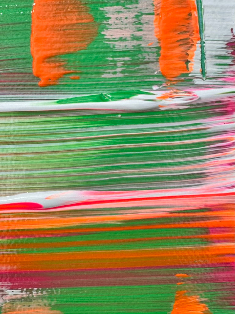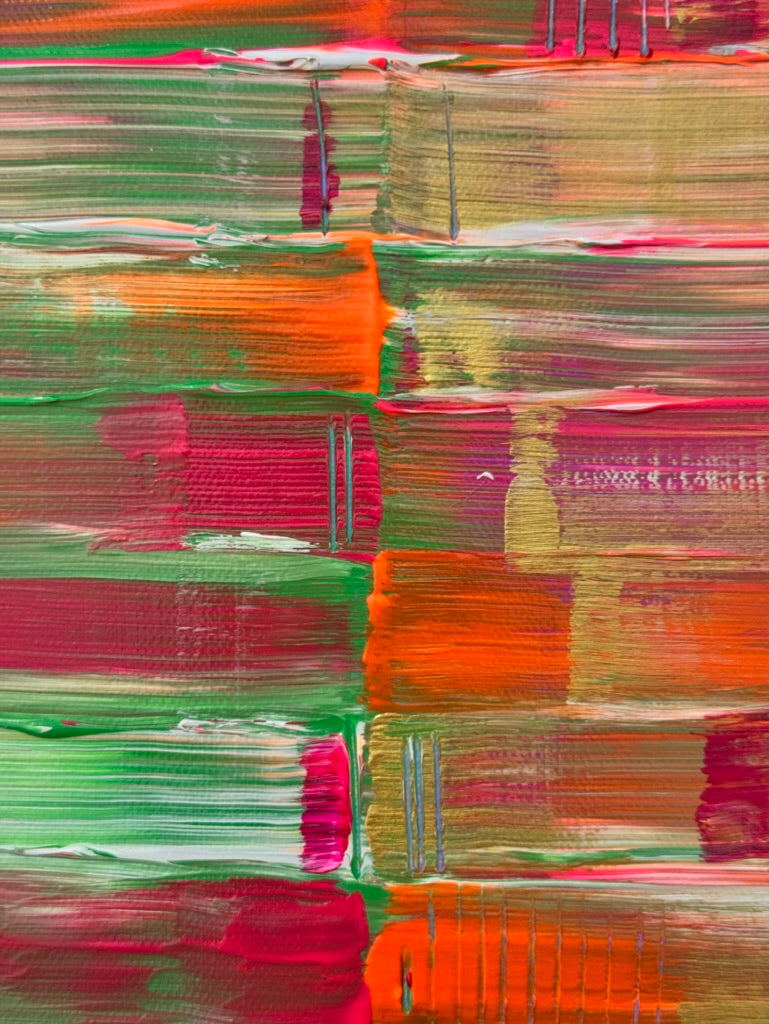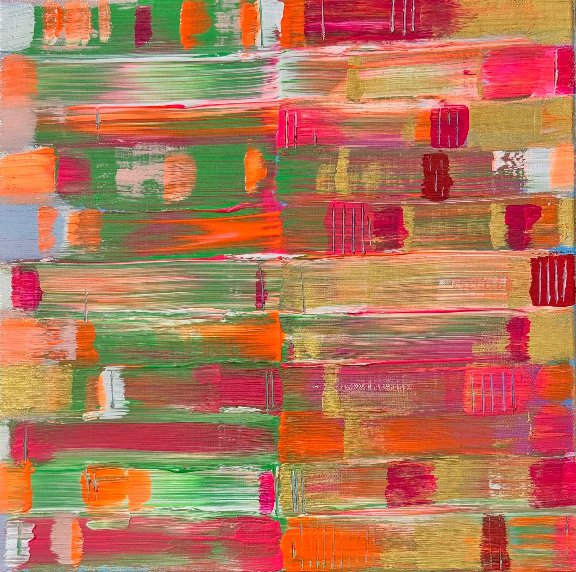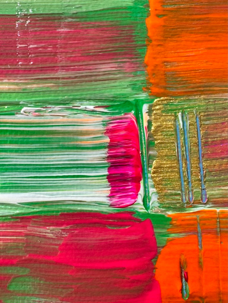 The way the colours layer and push against each other evokes the feeling of slipping between timelines. The brush strokes and vertical marks feel like codes holding the memory of transition and change.